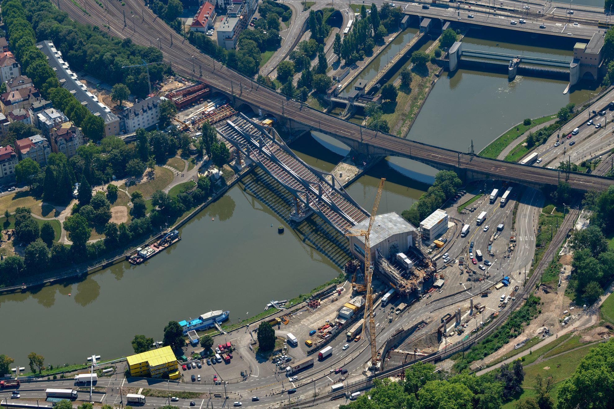 An der neuen Neckarbrücke für Stuttgart 21 sollen auf Bad Cannstatter Seite die restlichen Brückenteile angeliefert und eingebaut werden. Hierzu muss eine Fahrspur der Schönestraße gesperrt werden. Eine Ampel regelt den Straßenverkehr unterhalb des Traggerüsts.