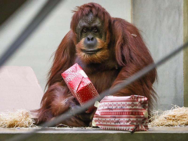 Stuttgart - 106 Weihnachtspäckchen für Gorillas, Bonobos und Orang-Utans: Das hat es am ersten Weihnachtstag für die Menschenaffen im Zoologisch-Botanischen Garten Wilhelma in Stuttgart gegeben. Kibo und seine Gorilla-Sippe, Kombote und ihre Bonobo-Bande sowie die beiden Orang-Utan Damen Carolin und Moni erfreuten sich an den Geschenken. Wie die meisten Menschen lieben auch Menschenaffen Leckereien. Deshalb enthielten die in Geschenkpapier gehüllten Kartons verschiedene affengerechte Gaumenfreuden wie Popcorn, Rosinen, "Affenflips" oder Apfelringe.