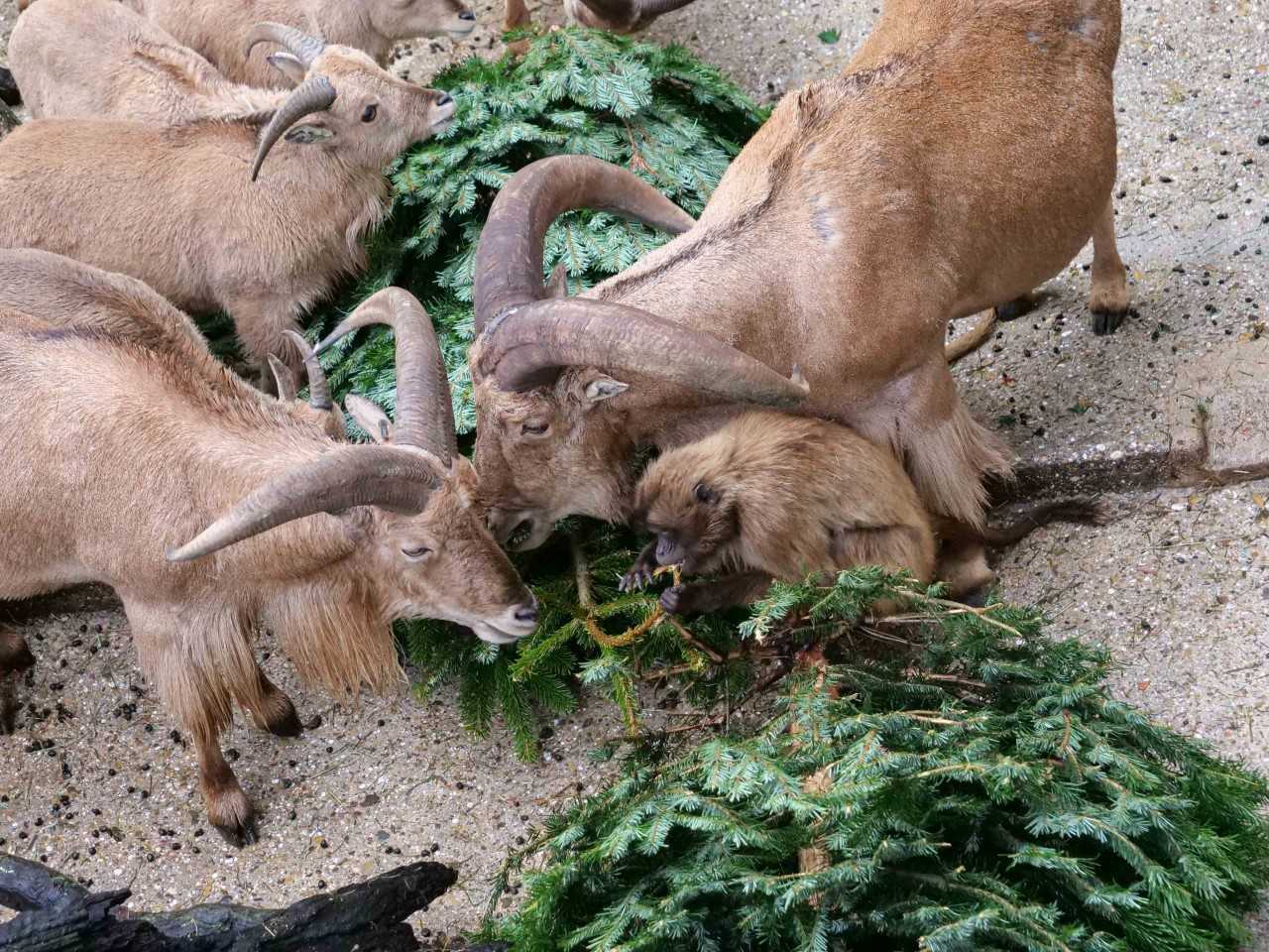 Die Nadeln einer Tanne oder Fichte schmecken besonders den „Afrikanischen Zwergziegen, Dülmener Ponys, Poitou Eseln, Limpurger Rindern“ oder „auch den Yaks, Milus und den Mesopotamischen Damhirschen“. Den asiatischen Elefantenkühen Pama und Zella schmecken die Zweige zwar nicht, verschlingen sie aber trotzdem. Im Primatengehege wird der Baum meist zweckentfremdet: Die Tannen werden da an einem Seil aufghängt und zu einer Affenschaukel umfunktioniert. Das gefällt besonders dem Gorillanachwuchs. „Für viele Raubtiere ist vor allem der reizvolle Geruch unterhaltsam“, heißt es weiter in der Mitteilung. Auf den Subtropenterrassen nutzen die Vögel hingegen die Bäume für Dekorationszwecke und können es sich auch nicht nehmen mal auf den „piksigen Ästen“ probe zu sitzen.