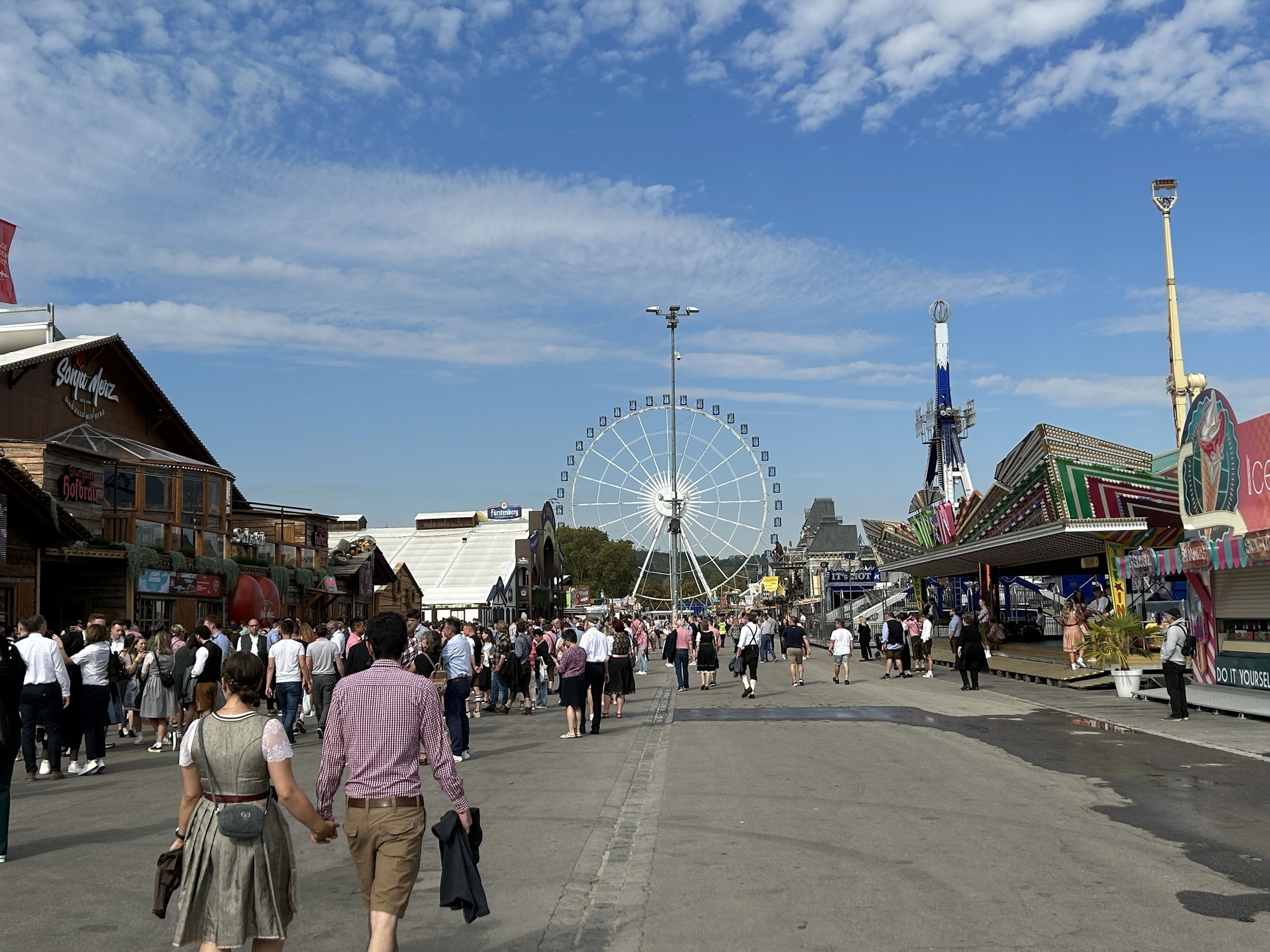 Ich schaue beim Wasen-Parkplatz vorbei. Tote Hose, alles frei. Wie viel Uhr haben wir? Das Ding, das sich in der Ferne dreht, ist das Riesenrad, es hat keine Zeiger. Ich will jetzt nicht das Handy rausholen und nachschauen. Da wären sicher Nachrichten aus der Redaktion drauf, die mich aus meiner Wasen-Wochenende-Wahnsinnsstimmung rausreißen würden. Naja, sagen wir Mittag. Ein Mann in Paketbotenuniform huscht an mir vorbei, ein Paket unter dem Arm, einen Scanner in der Hand. Hat sich da jemand auf den letzten Drücker noch eine Lederhose per Expressversand bestellt? Eine schöne Vorstellung, die ich mir nicht zerstören möchte, in dem ich die Wahrheit herausfinde. Also lasse ich ihn ziehen.