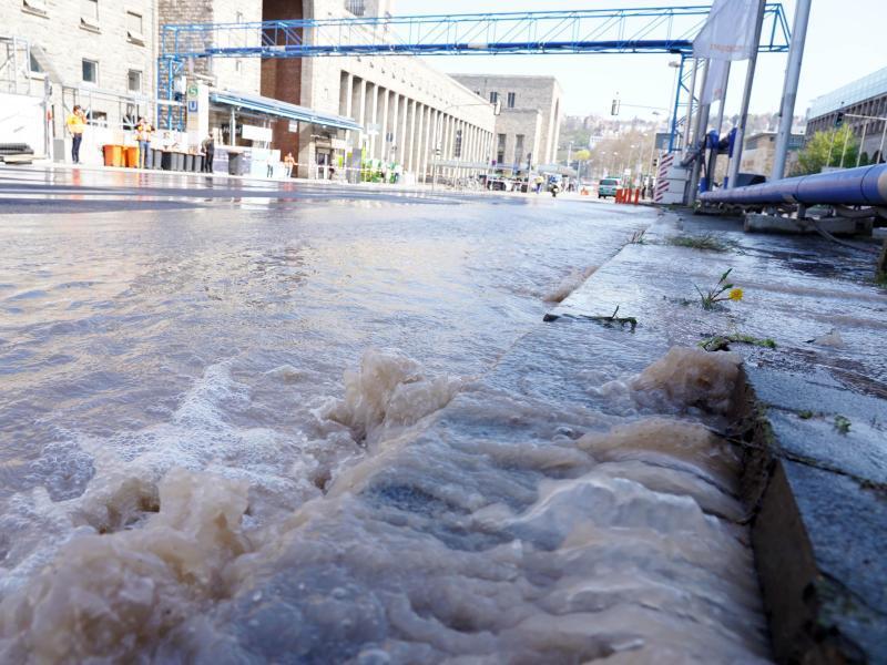 Wasser steht nach einem Rohrbruch auf der Straße am Hauptbahnhof in Stuttgart. Foto: Andreas Rosar/Fotoagentur-Stuttgart/dpa © dpa