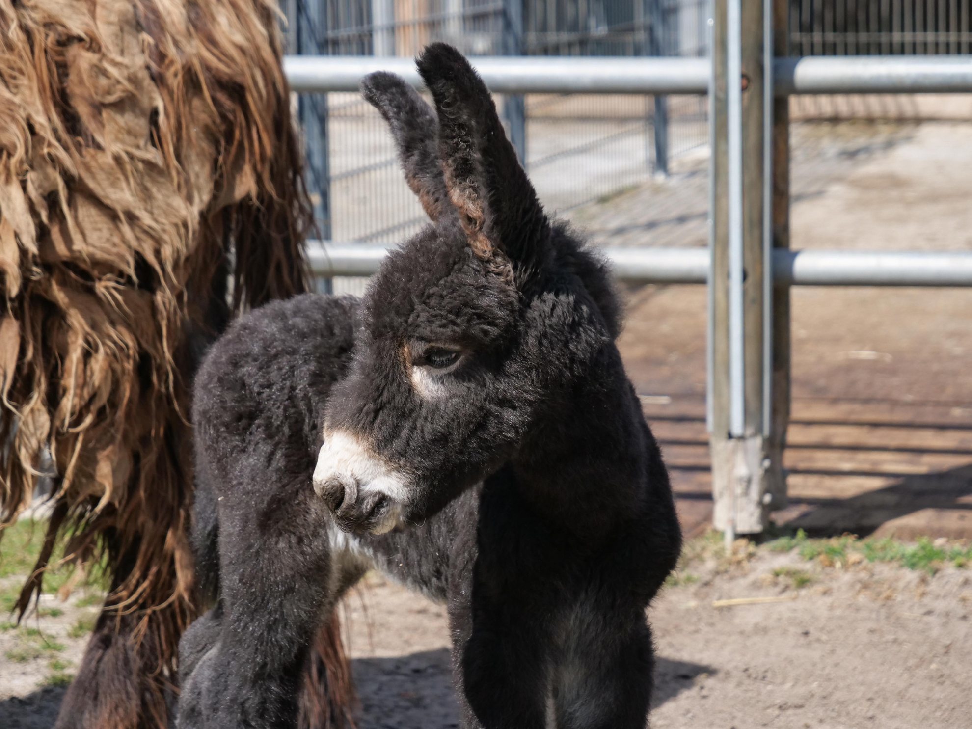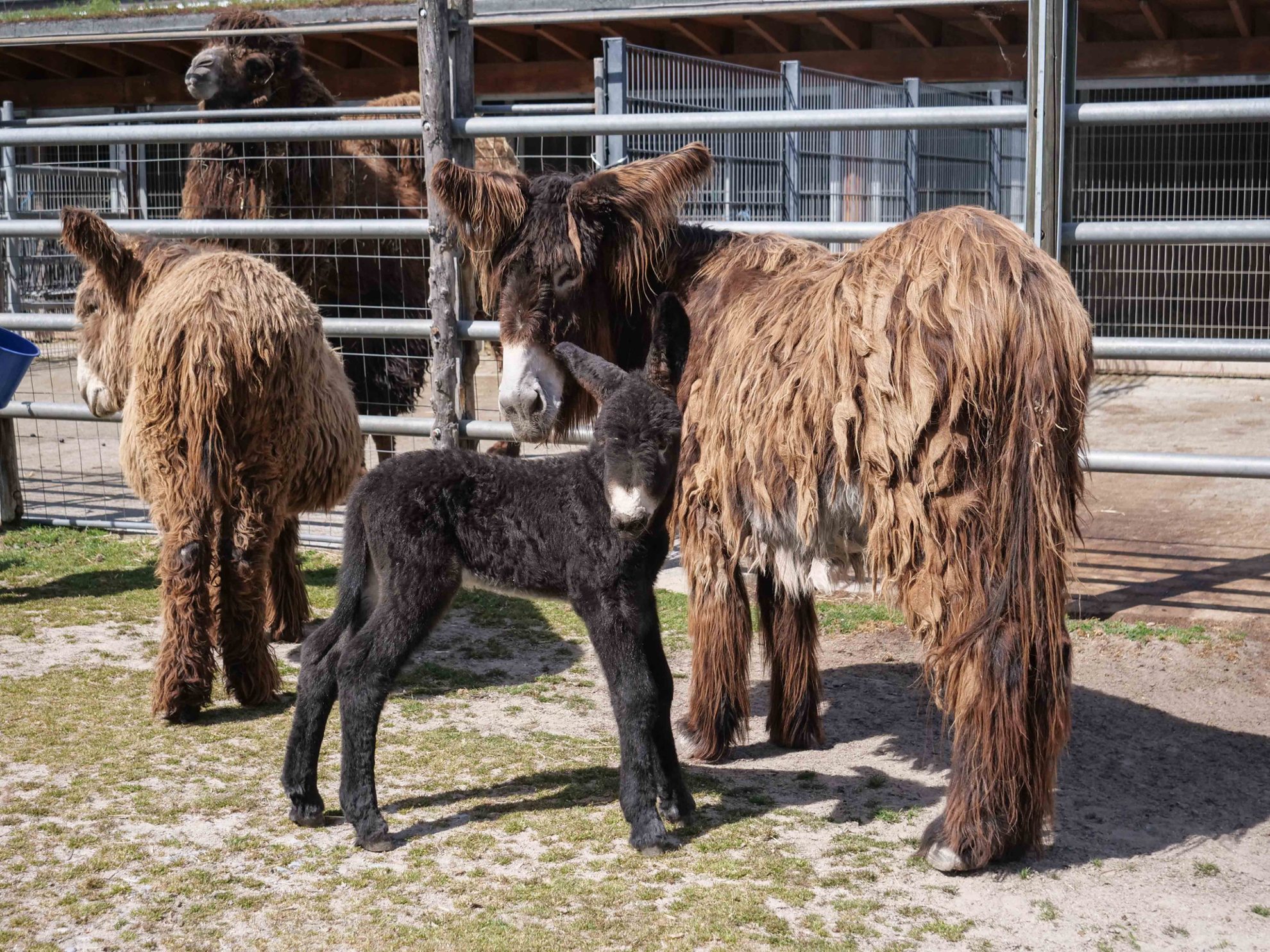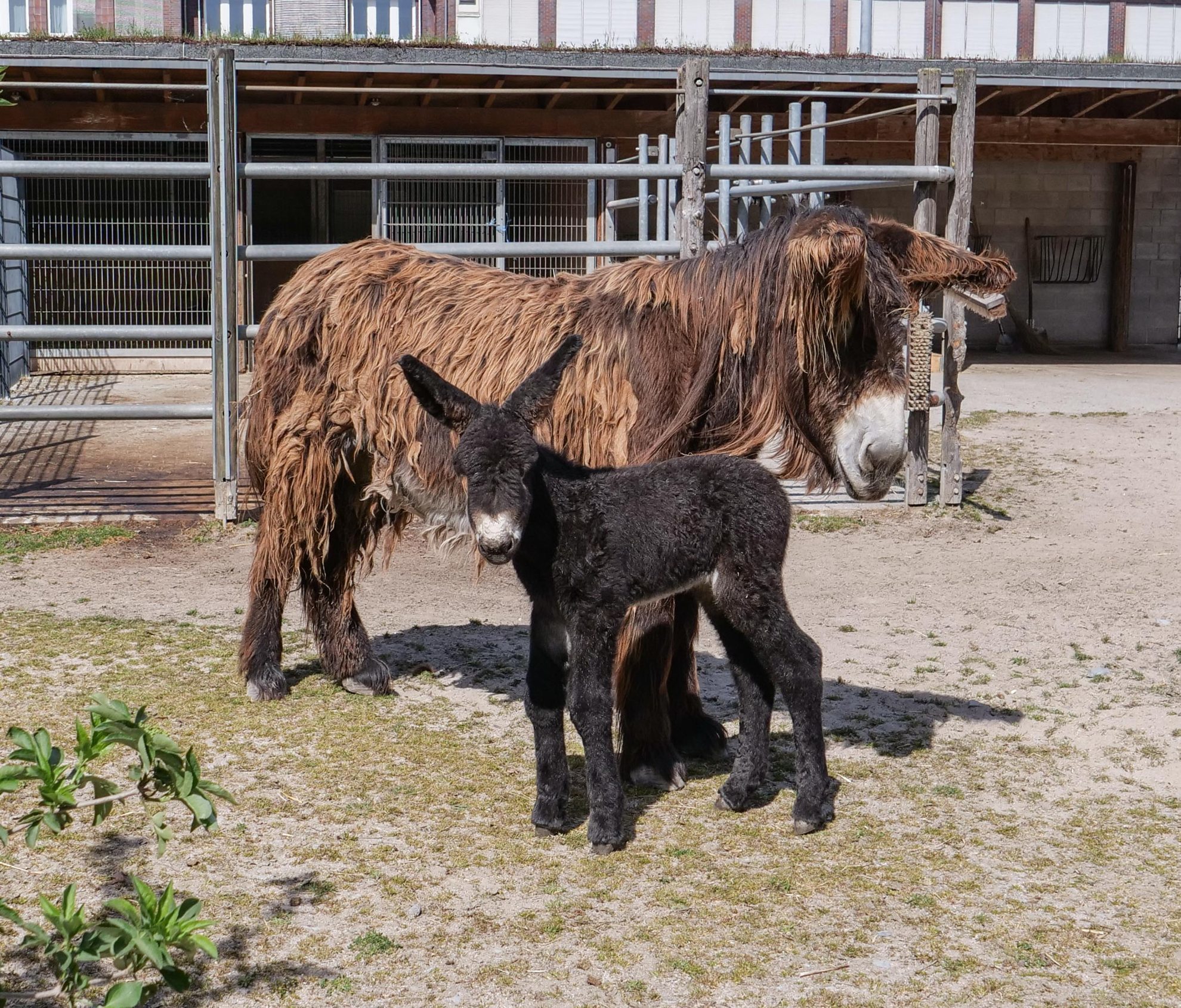Eine morgendliche Überraschung war auch das Fohlen bei den Poitou-Eseln auf dem Schaubauernhof. Das neugeborene Langohr stand am Ostersonntag (12. April) pünktlich zum Dienstbeginn schon fest mit seinen vier stämmigen Beinen im Leben. Im Gegensatz zu Mutter Brise trägt die kleine Stute noch nicht das rassetypische zottelige Haarkleid, das sich erst im Alter von einem Jahr entwickelt. Das Fohlenfell ist zunächst sehr dunkel, kurz und plüschig, bevor es sich langsam aufhellt. Die Haustierrasse stammt aus dem Westen Frankreichs und ist schon seit dem 10. Jahrhundert bekannt. Waren sie einst zur Züchtung großer und leistungsstarker Maultiere beliebt, standen die Poitou-Esel in den 70er Jahren des 20. Jahrhunderts fast vor dem Aussterben.