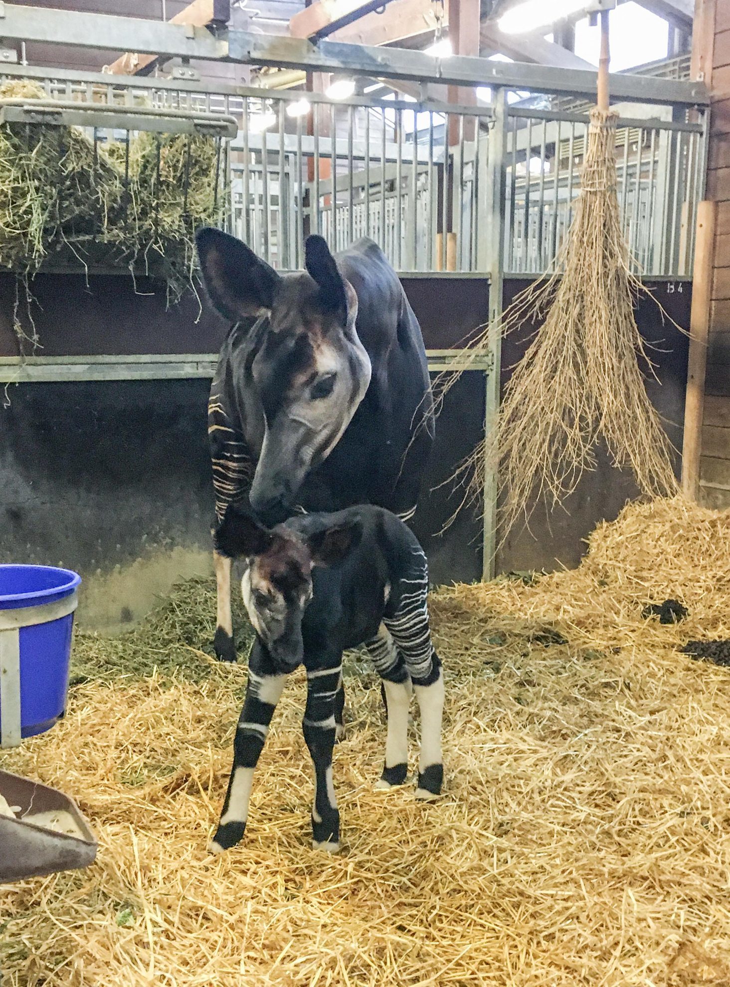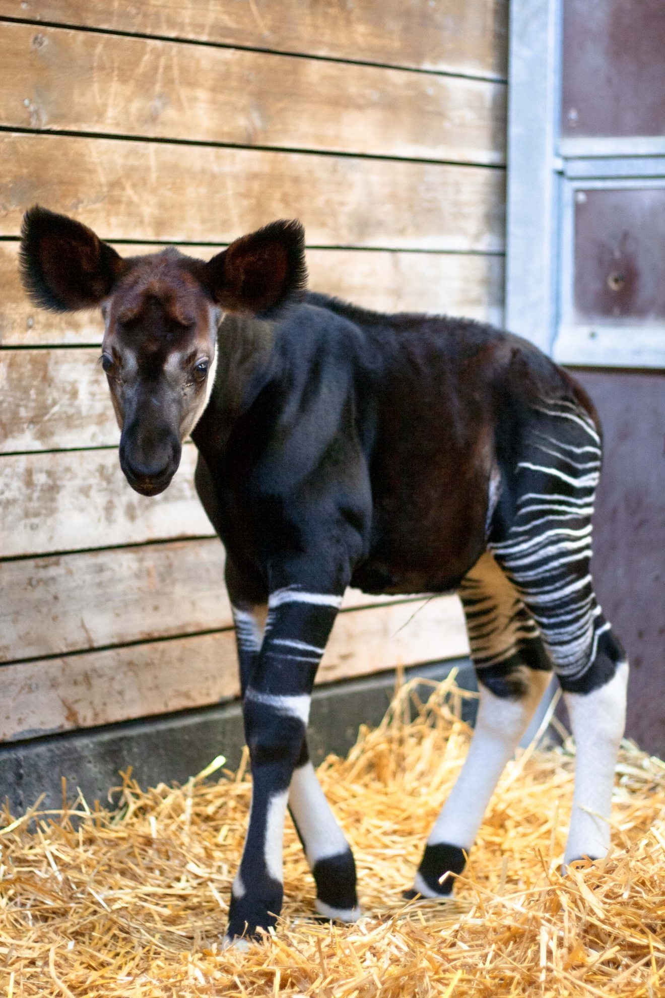 Die Okapis sind in ihrem Heimatgebiet, der Demokratischen Republik Kongo, stark gefährdet. Dort leben schätzungsweise noch 15.000 dieser scheuen Tiere. Nur rund 70 Waldgiraffen gibt es in 24 europäischen Zoos – nun verstärkt durch den neugeborenen Okapibullen des Zoologisch-Botanischen Gartens. Am Dienstag (7. April) kam das Kalb ganz unbeobachtet auf die Welt. „Als wir morgens kamen, stand der Kleine schon und Nyota hatte ihn sauber und trocken geleckt“, so Revierleiter Daniel Wenning. „Sie säugt ihn regelmäßig und kümmert sich wirklich hervorragend um ihn. Besser könnte es nicht laufen.“