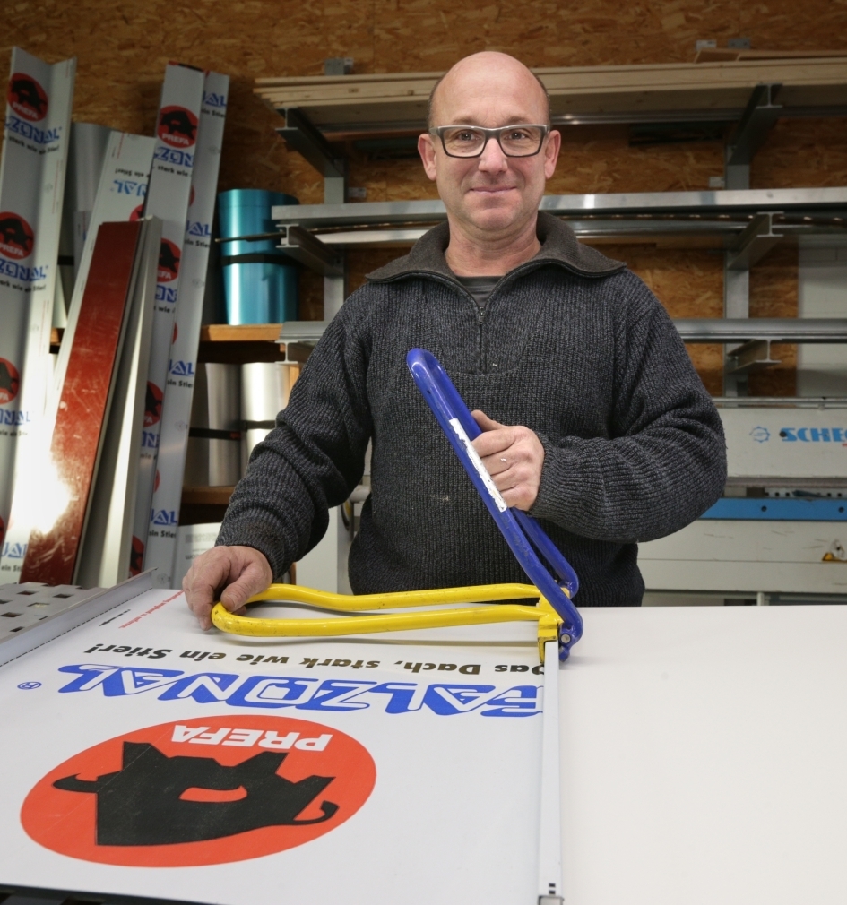 „Die körperliche Arbeit ersetzt Bodybuilding und Sport“, sagt Dachdeckermeister Volker Schlichenmaier lachend. Nicht nur als Handwerker sind sie gefragt: „Aufmaß, Beratung und Angebote schreiben gehören zum Geschäft“ meint er. Die Besuche der Kunden legt er in die Abendstunden, nach Feierabend. Tagsüber sind er und seine Mitarbeiter auf der Baustelle. Ihr Arbeitstag ist stets vom Wetter beeinflusst – bei klirrender Frostkälte wie in den letzten Februartagen oder bei anhaltendem Regen und Schnee ist es auf dem Dach viel zu gefährlich. Dann ruht die Baustelle. Die Mitarbeiter sind in der betriebseigenen Werkstatt zur Stelle, wenn es im Bereich der Blechverarbeitung etwas zu erledigen gibt. Denn die Dachexperten sind für alle Belange rund ums Dach spezialisiert – auch die Bauflaschnerei zählt dazu.