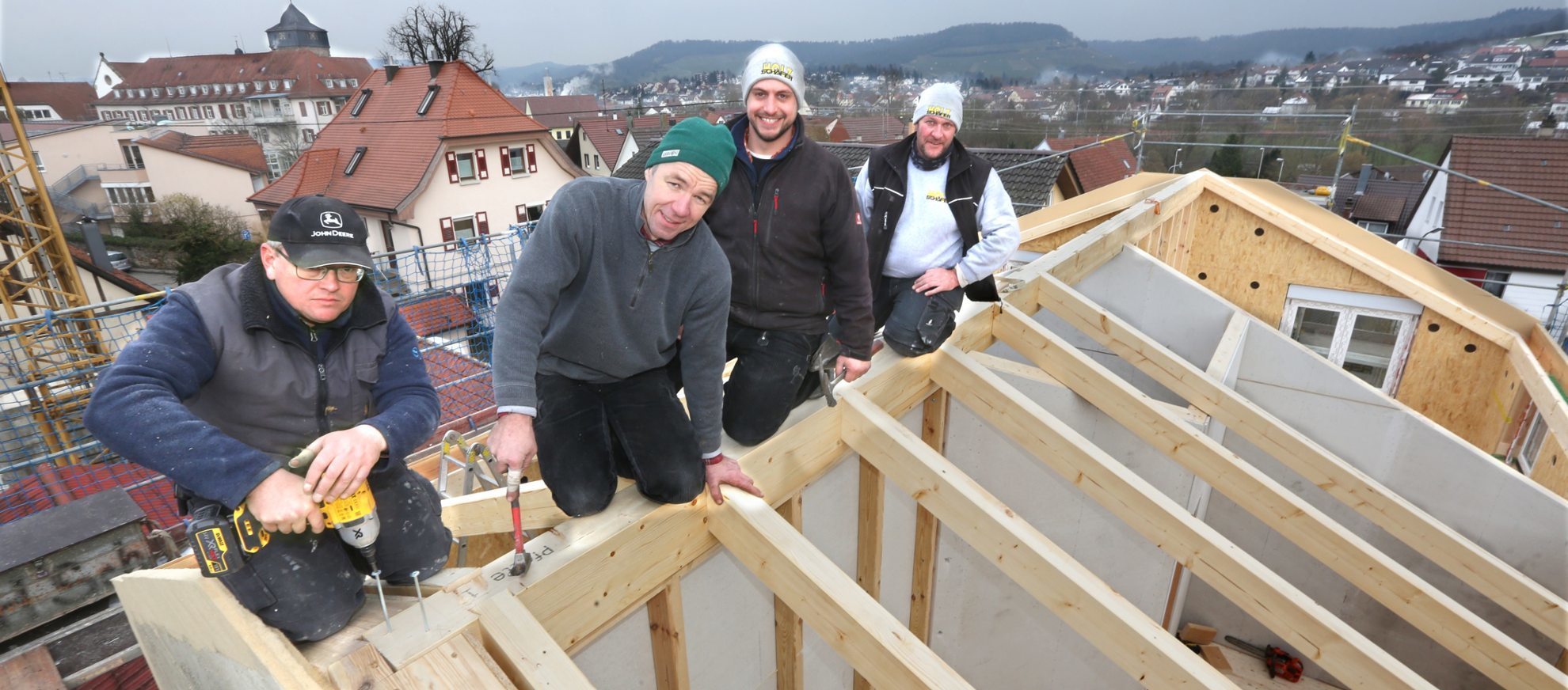 Von frühmorgens und auf Wunsch bis nach Feierabend steigt Firma Schäfer Holzbau ihren Kunden aufs Dach. Auch morgens zwischen neun und halb zehn ist im Familienbetrieb Action angesagt.