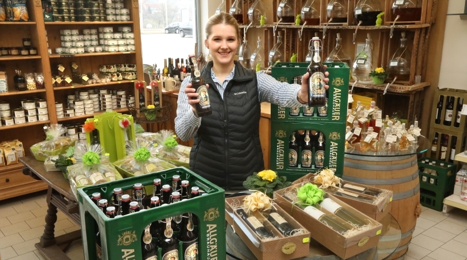 Ehepaar Hubschneider kombiniert den familiengeführten Getränkemarkt ideal mit der Wirtsstube. Regionale und Allgäuer Biere sowie ein großes Sortiment an württembergischen Weinen gibt’s hüben wie drüben. Ein Bereich des Getränkemarkts ist Lebensmitteln regionaler Erzeuger gewidmet. Die Eier vom Bauernhof Klemens, das Mehl aus der Seemühle Unterweissach, es gibt Zumhofer Hausnudeln, Schwäbisch Hällische Wurst, Senfvariationen und Dips aus Maiers Genussmanufaktur, Allgäuer Honig und Tees sowie besondere Kräuter- und Blütensalze von Aurelia.