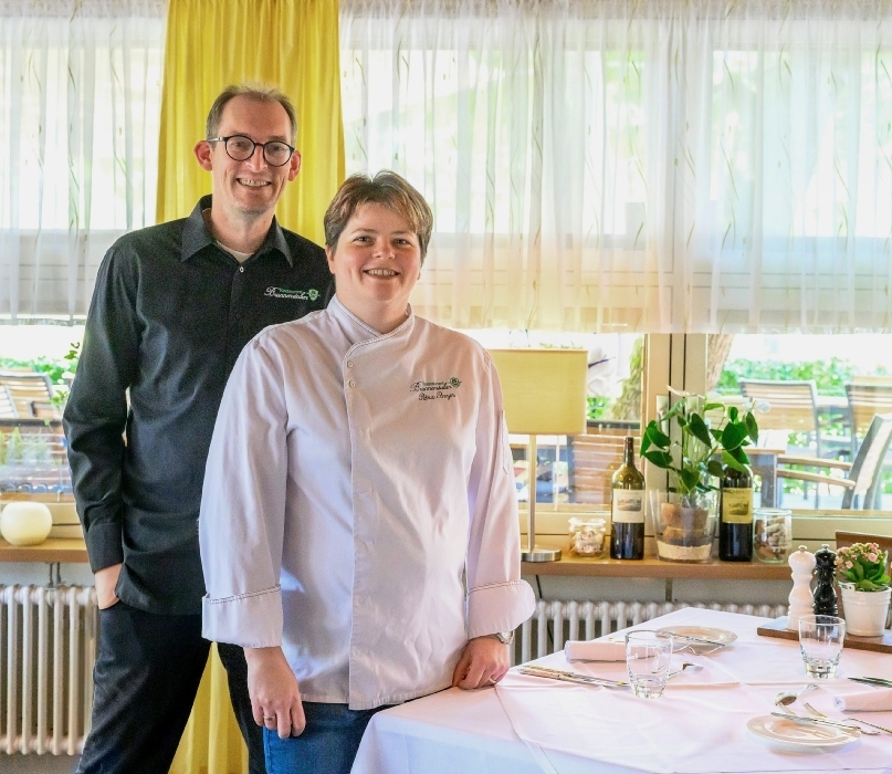Wer sich gerne kulinarisch überraschen lässt, kommt bei „Immer wieder sonntags“ in den Brunnenstuben in Beinstein voll auf seine Kosten. Denn von 16.30 bis 18 Uhr können Gäste hier ein Vier-Gänge-Überraschungsmenü für 55 Euro bestellen und gespannt sein, welche Kreationen aus der schwäbisch-mediterranen Küche diesmal auf die Teller kommen. Verraten werde bis zuletzt nichts, sagt Inhaber und Serviceleiter Thorsten Beyer, „aber wenn jemand Allergien hat, Vegetarier ist oder etwas nicht mag, kann er uns das natürlich sagen“. Seit Mai lässt sich Küchenchefin Petra Beyer diese Gänge, zusätzlich zu den regelmäßig wechselnden Gerichten auf der Karte, allwöchentlich einfallen. Wie in den Brunnenstuben üblich, sind die Zutaten frisch, saisonal und meist von regionalen Lieferanten. Ein gutes Produkt dürfe aber auch mal von woanders kommen, sagt die Köchin, die ihr Handwerk in einem Sterne-Restaurant gelernt hat. „Es kann auch mal schottischen Lachs geben. Man kann ja nicht das ganze Jahr nur Forelle machen!“ Wichtig ist ihr aber immer, das Grundprodukt wertzuschätzen, weshalb sie beispielsweise beim Fleisch dem nachhaltigen Ansatz „from nose to tail“ folgt.