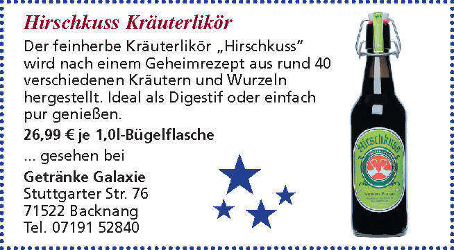 Getränke GalaxieHirschkuss Kräuterlikör Teilen Der feinherbe Kräuterlikör „Hirschkuss“ wird nach einem Geheimrezept aus rund 40 verschiedenen Kräutern und Wurzeln hergestellt. Ideal als Digestif oder einfach pur genießen. 26,99 € je 1,0l-Bügelflasche