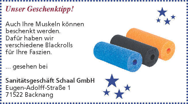 Sanitätsgeschäft Schaal GmbHUnser Geschenktipp! Teilen Auch Ihre Muskeln können beschenkt werden. Dafür haben wir verschiedene Blackrolls für Ihre Faszien.