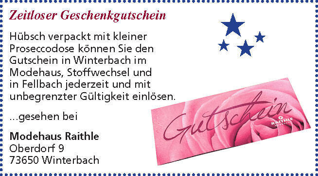Modehaus RaithleZeitloser Geschenkgutschein Teilen Hübsch verpackt mit kleiner Proseccodose können Sie den Gutschein in Winterbach im Modehaus, Stoffwechsel und in Fellbach jederzeit und mit unbegrenzter Gültigkeit einlösen.