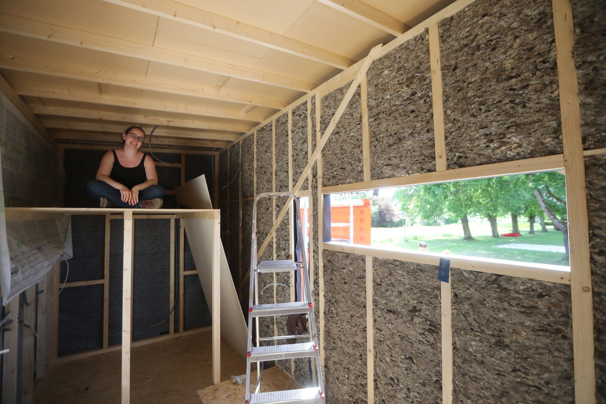 Zusammen mit sechs anderen Teilnehmern hat er im Workshop mit Krenzlin und ihrem Team den zweiten Bauabschnitt eingeläutet, bei dem mit den Arbeiten für die Gebäudehülle begonnen wurde. Ein Teil des Innenausbaus ist nun geschafft. Während des letzten Wochenendes werkelten die Häuslebauer am Dach und der Bodenkonstruktion. Außerdem entstanden die beiden oberen Etagen, sogenannte „Lofts“. Auch ein Teil der wolligen Dämmung kam in die Wände. Den Rest will die Bauherrin bis zum „Tag der offenen Werkstatt“ am Sonntag selbst schaffen.