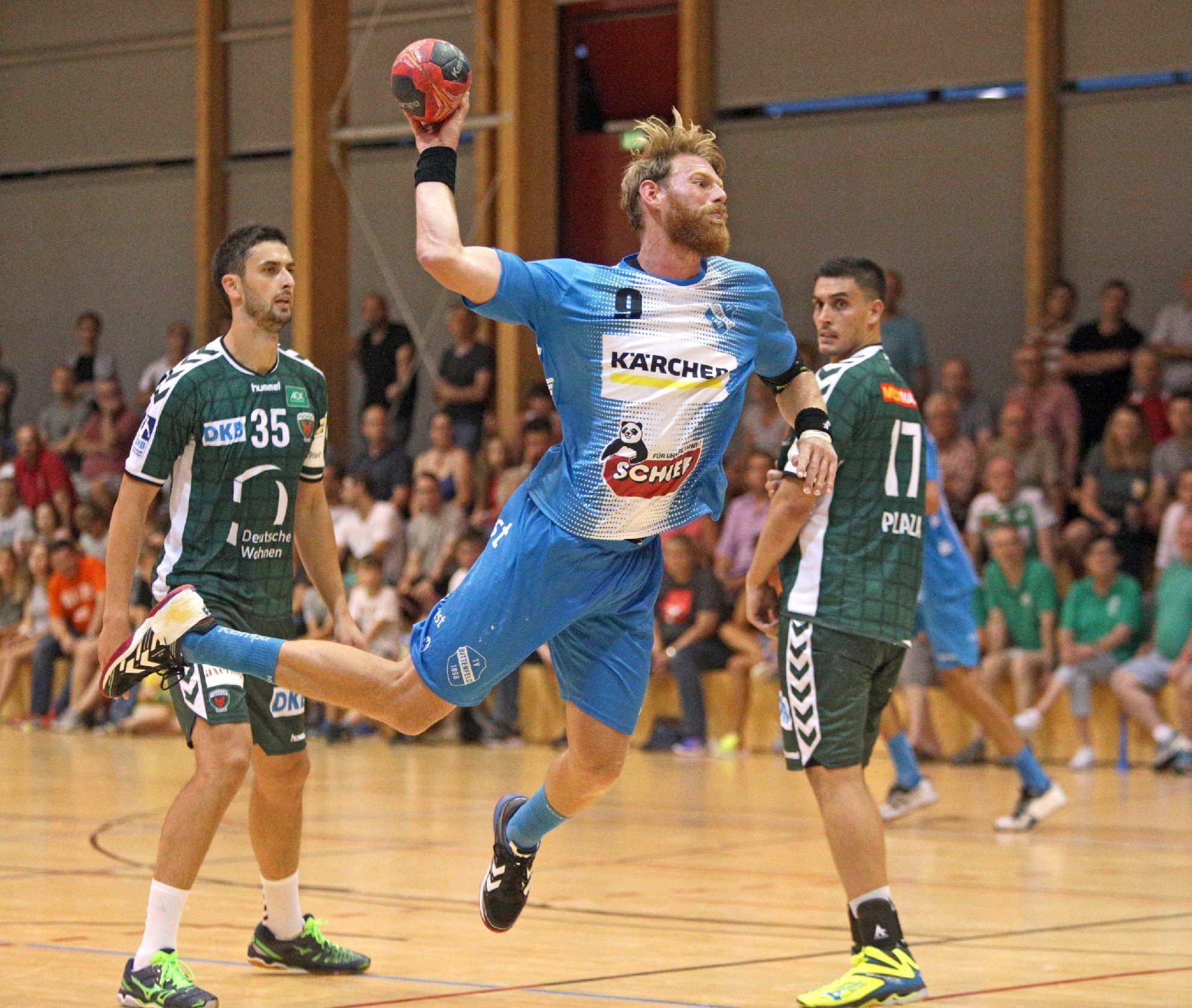 Manuel Späth, hier im Testspiel gegen die Füchse Berlin (links Marko Kopljar, rechts Ignacio Plaza Jiménez), hat sich beim TVB gut eingelebt. Bei seinem neuen Club trifft er seine ehemaligen Göppinger Mitspieler Michael Schweikardt, Michael Kraus, Felix Lobedank und Simon Baumgarten wieder. © Ralph Steinemann