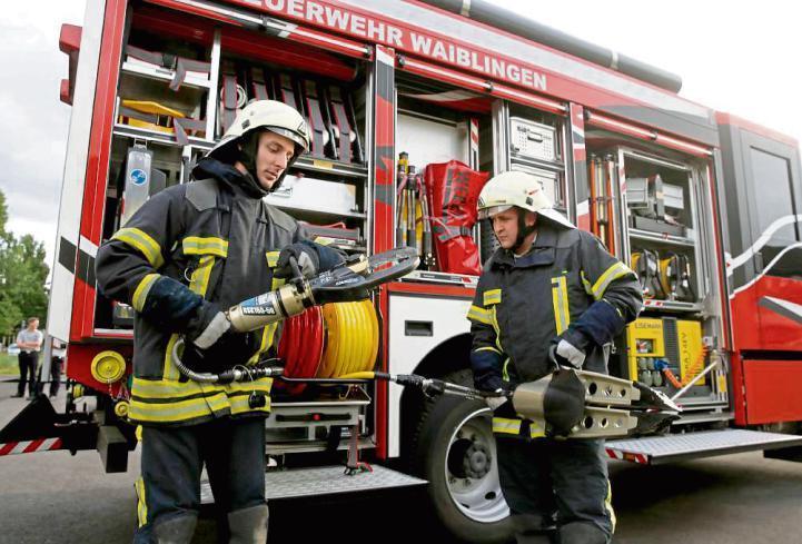 Neue Errungenschaft der Waiblinger seit drei Monaten: das Hilfeleistungs-Löschfahrzeug HLF 20. „Unser Allrounder“, meint Jochen Wolf, denn in dem Auto mit neun Mann Besatzung steckt die Ausrüstung für einen Großteil der Feuerwehr-Aufgaben. Die 20 steht für 2000 Liter Tankvolumen und 2000 Liter pro Minute Pumpenleistung. Was nach Adam Riese bedeutet, dass das HLF seinen gesamten Wasservorrat in 60 Sekunden ausspeien kann. Grob gesagt, sind auf der linken Seite des Fahrzeugs die Instrumente verstaut, die im weiteren Sinn zum Bereich Löschen gehören: neben Feuerlöschern und klassischer Kübelspritze für brennenden Papierkörbe zum Beispiel den Tragekorb, mit dem die ersten Männer, die in ein brennendes Haus gehen, den Schlauch mitführen. Ebenso das große Schaumrohr zum Löschen brennender Flüssigkeiten und das Sprungpolster, das im äußersten Notfall von vier Männern positioniert wird. „Ich hab’ es nie im Einsatz erlebt und ich möchte es auch nicht erleben“, sagt Thomas Zuber, Fachgruppenleiter Technik. Vier Sprungtücher wie früher hat die Feuerwehr nicht mehr, zu groß war dabei die Unfallgefahr – auch für die Helfer. Auf der rechten Fahrzeugseite lagert eine gewaltige Schere mit einer Schnittkraft von 50 Tonnen und der Spreizer mit 33 Tonnen zum Öffnen von Unfallautos. „Es ist im Prinzip so, als würden wir eine zerknüllte Coladose wieder auseinanderziehen.“ Auch einen Stromgenerator und LED-Scheinwerfer zum Ausleuchten nächtlicher Einsatzorte führt die Freiwillige Feuerwehr im HLF 20 mit sich.
