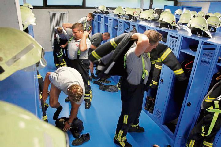 Mitten in der Nacht geht der Piepser: Wohnungsbrand. Husch springen die Feuerwehrleute aus ihren Betten, noch im Schlafanzug ins Auto und los zum Feuerwehrhaus. Von den Parkplätzen sofort in die Umkleiden. Jeder hat seinen Doppelspind, einen für Schwarz wie Einsatzkleidung und einen für Weiß wie Privatwäsche. Wertsachen durch einen Schlitz geworfen und sicher verwahrt, in Sekundenschnelle in Hosen und Stiefel geschlüpft, die Jacken angezogen und die Helme aufgesetzt. Schon laufen sie in die Fahrzeughalle, und der Maschinist startet mit Blaulicht und Martinshorn. In der Regel sind vom Alarm bis zum Start drei bis vier Minuten vergangen. Laut Alarm- und Ausrückeordnung muss der erste Trupp zehn Minuten nach Alarm am Einsatzort sein, was in Neustadt gut funktioniert, denn vom neuen Feuerwehrhaus aus erreichen die Fahrzeuge jeden Punkt der Ortschaft in höchstens vier Minuten.