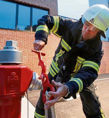 1000 bis 2000 Liter führen Standard-Feuerwehrfahrzeuge mit sich, das reicht zum Löschen von Fahrzeugen, in der Regel auch für Zimmerbrände. Das Fahrzeug mit dem größten Tankvolumen in Waiblingen fasst 5000 Liter. Doch wäre es leichtsinnig, die Tanks einfach leer zu pumpen, schon weil ein Feuer sich durch Verpuffungen schlagartig ausweiten kann. Markus Fried, Zugführer und ehemaliger Abteilungskommandant Neustadt, nennt die oberste Devise: „Das Wasser darf niemals ausgehen.“ So werden gleich am Einsatzort Wasserleitungen verlegt, über Hydranten wird dabei das öffentliche Wassernetz angezapft. In gut erschlossenen Gebieten findet sich mindestens alle 100 Meter ein Hydrant, wobei es sich hierzulande fast ausschließlich um „Unterflur-Hydranten“ handelt: Jedes Kind kennt die Deckel im Straßenbelag, im Schwäbischen am häufigsten in der Sonderform des großdeckeligen und tiefen „Württemberger Schachthydranten“, der ein spezielles Standrohr erfordert. In Neubaugebieten werden heute die DIN-Unterflur-Hydranten mit kleinerem Deckel verwendet. Seltenheitswert haben hier die Überflur-Hydranten in typisch roter Feuerwehr-Optik, wovon sich ein Übungsexemplar neben dem Neustädter Feuerwehrhaus befindet. Unbegrenzt kann die Feuerwehr nicht Wasser aus dem öffentlichen Netz entnehmen, sonst können durch Unterdruck Rohrbrüche entstehen.