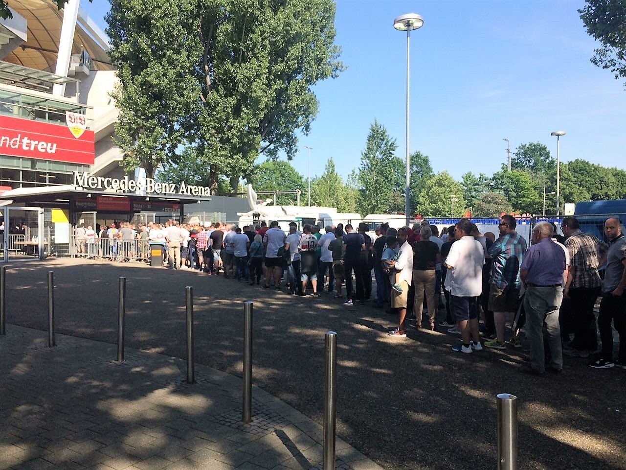 17:43 Uhr: Der Andrang ist riesig. Schon rund eine Stunde vor Beginn der Versammlung tummeln sich tausende VfB-Mitglieder in und um das Stadion.