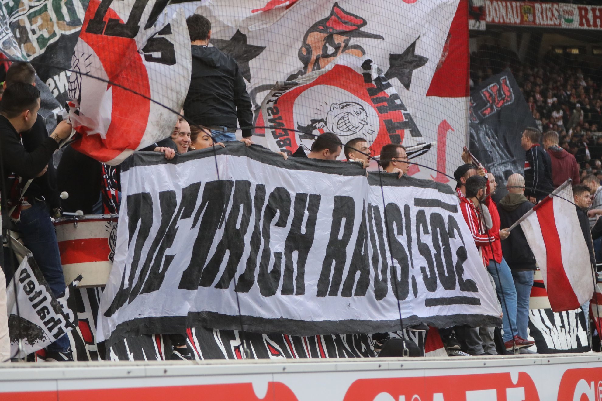Während das Spielgeschehen in den zweiten 45 Minuten müde vor sich hin plätscherte, sangen die VfB-Ultras gemeinsam mit den mitgereisten Fans aus Hannover zunächst gegen 96-Präsident Martin Kind, ehe dann auch VfB-Clubchef Wolfgang Dietrich mit Gesängen und Plakaten kritisiert wurde.
