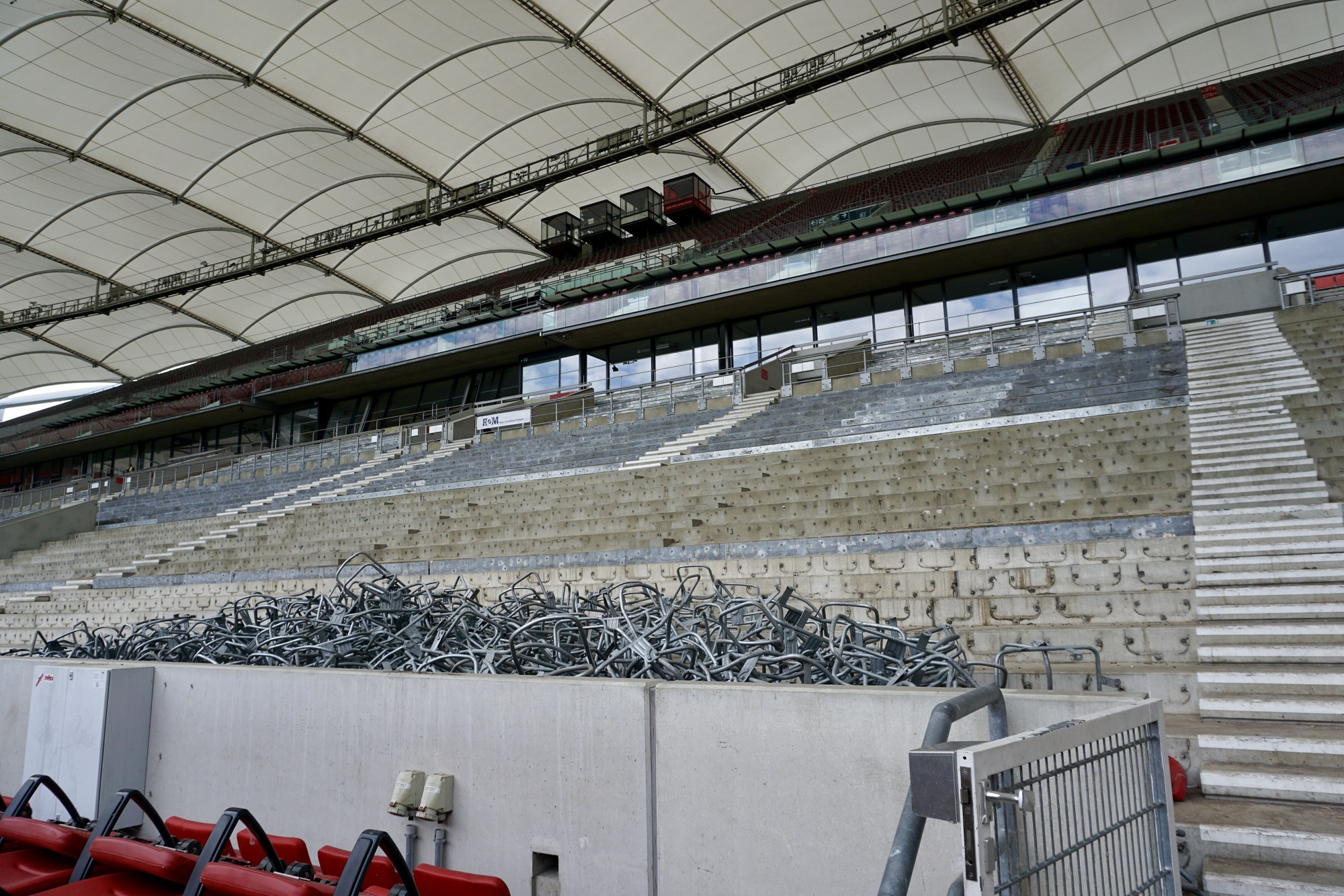 Abgebrochen werden auch die Treppenhäuser für die Tribünenaufgänge rechts und links vom Business-Center, dafür entstehen neue Erschließungsebenen für den Zuschauerbereich auf der Haupttribüne und dem darüber liegenden 2. Rang.
