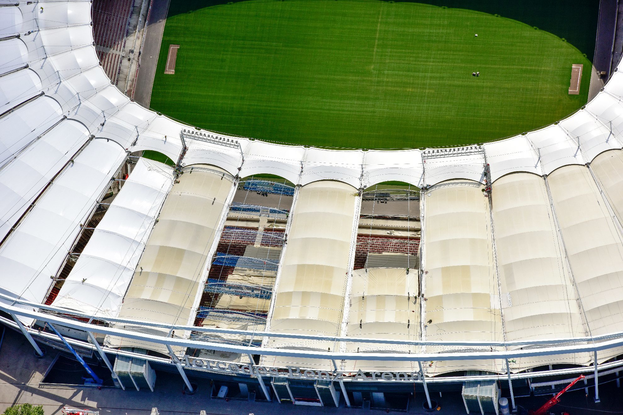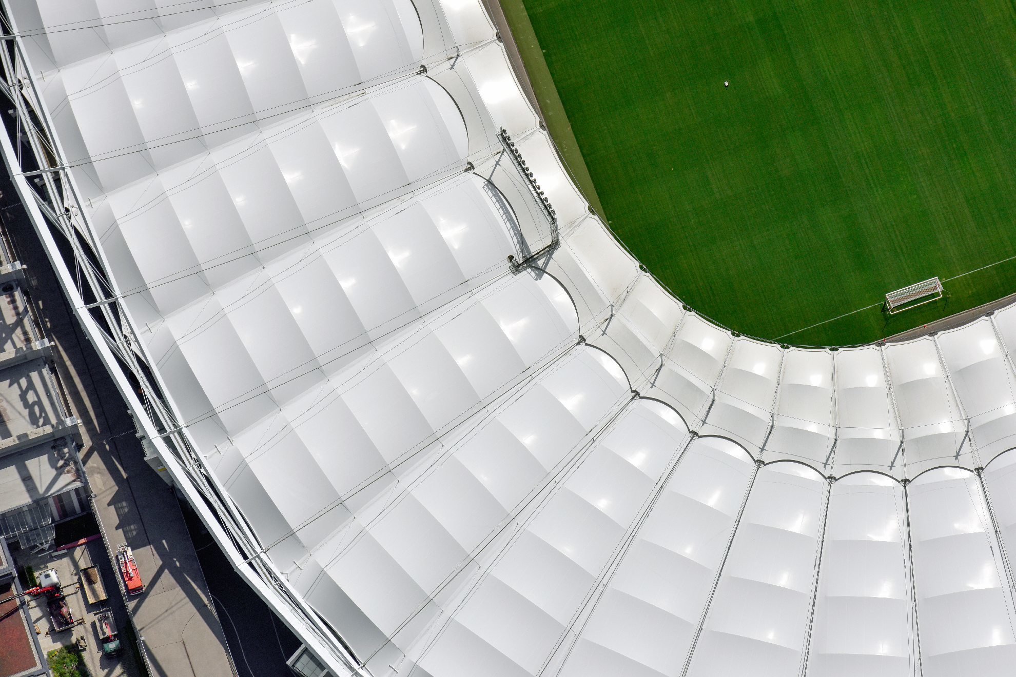 Insgesamt besteht das Arenadach aus 40 einzelnen Feldern mit einer Gesamtfläche von rund 37.000 Quadratmetern. In den vergangenen mehr als zwei Jahrzehnten war das Dach Wind, Wetter und Umwelteinflüssen ausgesetzt und musste nun erneuert werden.