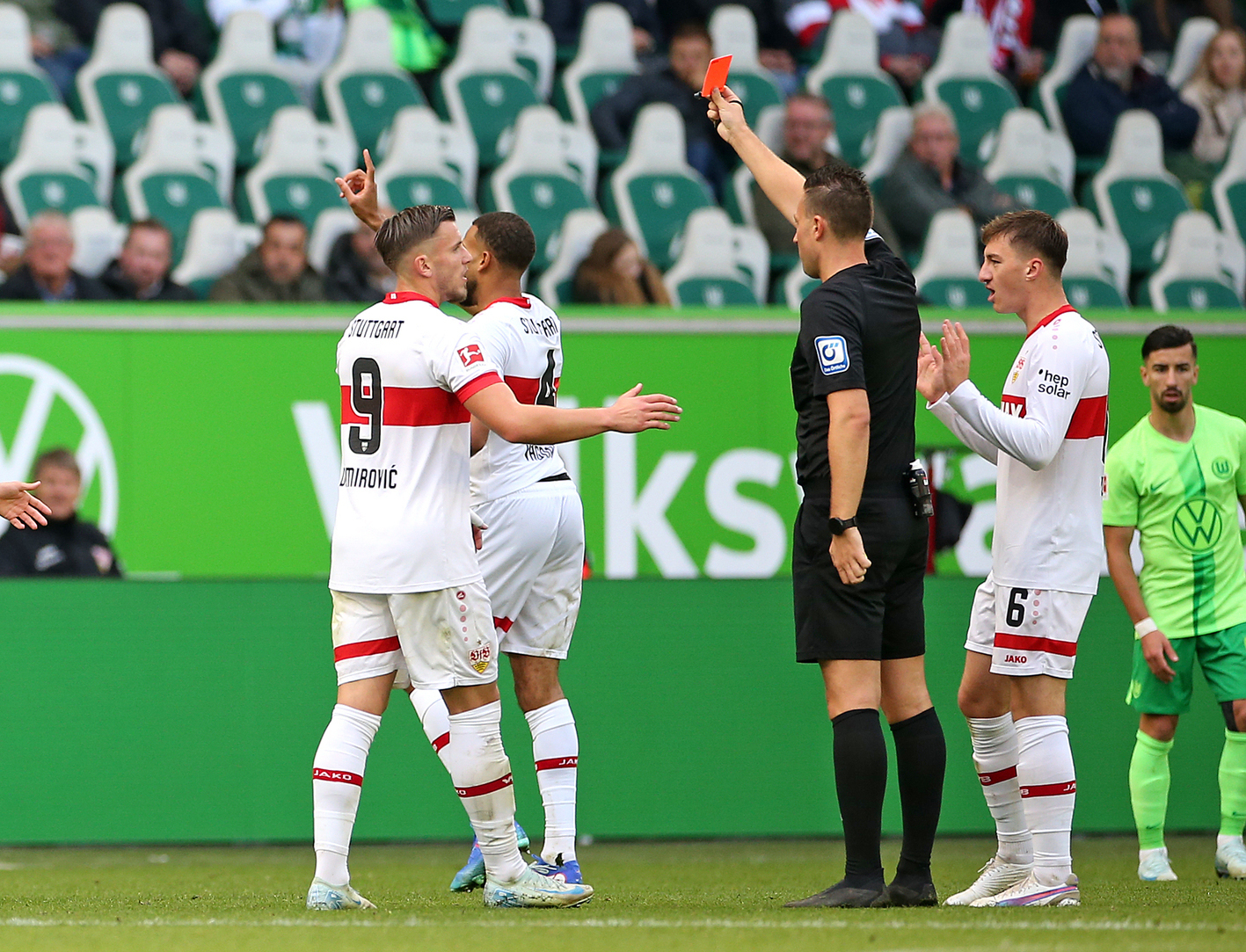 Es läuft die 63. Spielminute, als Sven Jablonski eine Fehlentscheidung trifft, die das gesamte Spiel des VfB Stuttgart beim VfL Wolfsburg beeinfusst: Der Referee schickt Atakan Karazor nach einem Zweikampf mit Maximilian Arnold mit Gelb-Rot in die Kabine. Trainer Sebastian Hoeneß und alle VfB-Profis protestieren lautstark, und die Zeitlupe zeigt: Karazor spielt den Ball und wird anschließend von Arnold getroffen. Es hätte also Gelb-Rot für den Wolfsburg-Profi und nicht für den Stuttgart-Kapitän geben müssen.