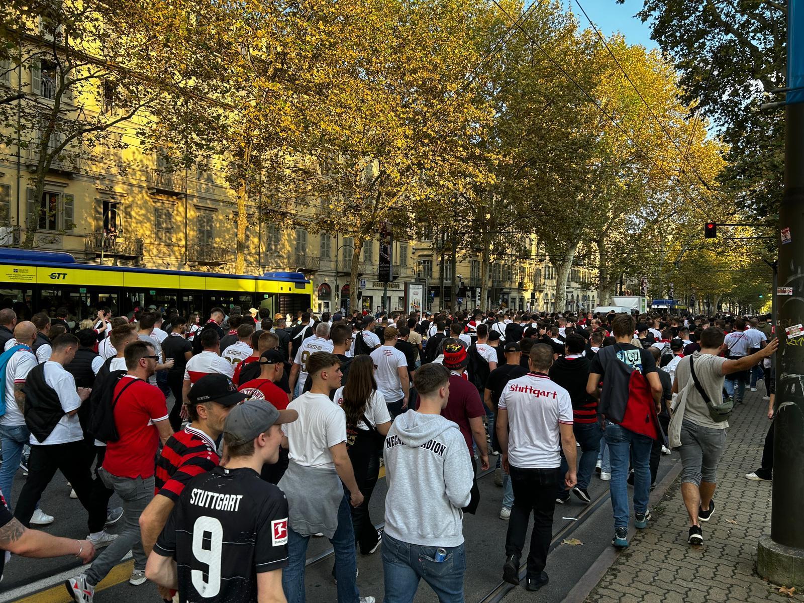 Um 12 Uhr traf sich die organisierte Fanszene am Piazza San Carlo, von Turinern als "Wohnzimmer der Stadt" bezeichnet. Keine 300 Meter vom ehrwürdigen Museo Nazionale del Risorgimento Italiano entfernt feierten die Stuttgarter Anhänger sich und ihren Verein. Manch ein Einheimischer muss sich verwundert die Augen gerieben haben, mit welcher Inbrust der schwäbische Gassenhauer "Nach all der Scheiße, geht’s auf die Reise. Stuttgart international!“ über den Piazza geschmettert wurde. Fest steht: Eine so große Menge an ausländischen Fans hat der Piazza, der im 17. Jahrhundert im Barock-Stil entstanden ist, schon lange nicht mehr gesehen.