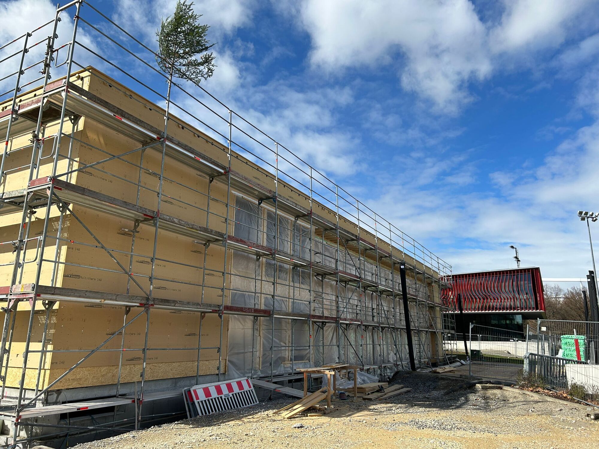 Bei dem Richtfest waren unter anderem der Vorstandsvorsitzende Alexander Wehrle sowie Präsident Claus Vogt vor Ort. Zimmermeister Karl-Heinz Schaible, Geschäftsführer der Firma Holzbau Schaible, sprach auf dem Dach den traditionellen Richtspruch und setzte den Richtfestbaum.