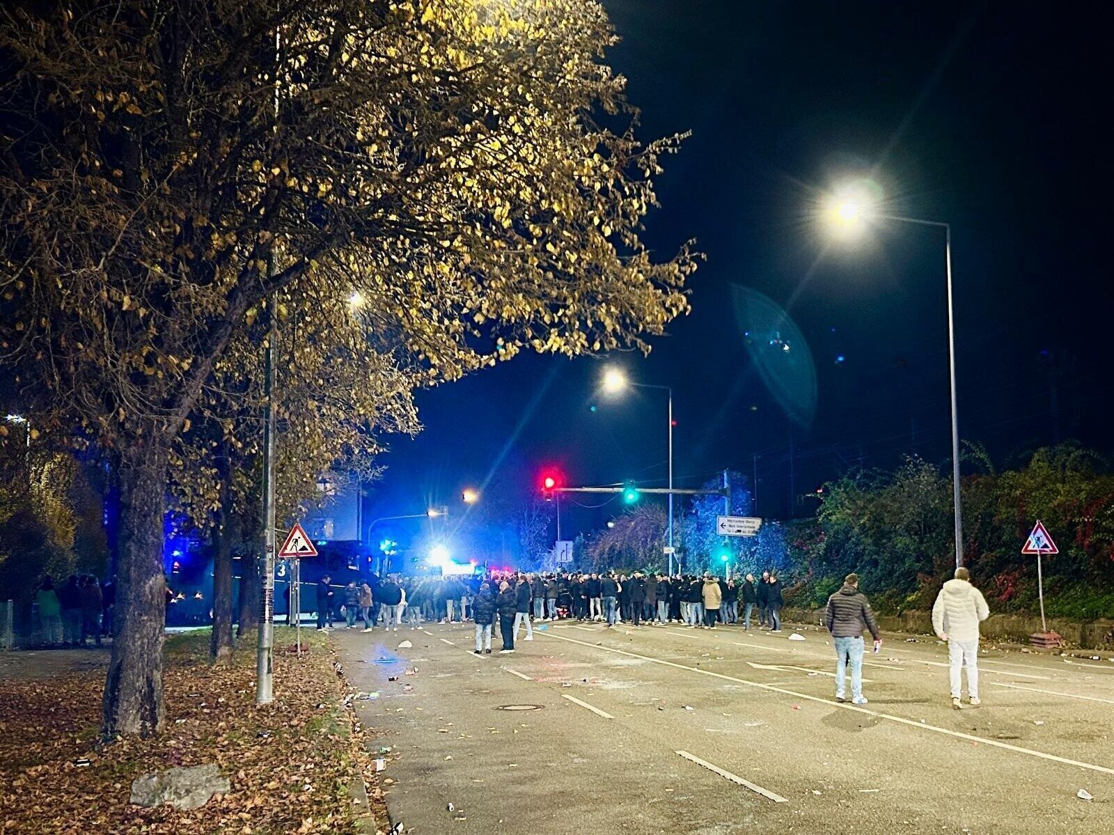 Die Benzstraße wird komplett gesperrt, die Abfahrt der B14 dicht. Stuttgart erstarrt kurz, wie Städte es tun, wenn Fußball auf Realität trifft. „Aus dem Fanmarsch heraus haben Rotterdam-Fans ein Baustellengelände betreten. Die Personen werden aufgefordert, es zu verlassen. Der Fanmarsch ist aktuell gestoppt“, twittert die Polizei. In einer zweiten Meldung klingt die Behörde wie eine leicht genervte Sportlehrerin: „Es wurde bereits Pyrotechnik gezündet und Personen haben sich vermummt. Unterlasst das!“ Und auch die Feuerwehr musste kurz eingreifen, als Glutnester in einem Gebüsch gelöscht werden mussten.